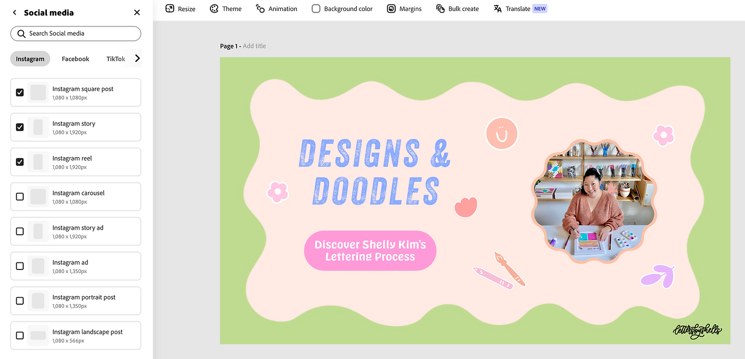 Yayy! I’ve been loving the animations tool in Adobe Express to bring my artwork to life! I also love that I can stay in sync with my fav apps like Photoshop and Illustrator while using Adobe Express + access all the fun Adobe Fonts, tons of fun templates, and stock photos too. It’s been my go-to for the past few years and I thought it’d be fun to share how I use Adobe Express in my workflow as a full-time artist + business owner! Sharing a sneak peek below.